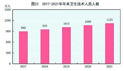 年末全國(guó)共有醫(yī)療衛(wèi)生機(jī)構(gòu)103.1萬個(gè),其中醫(yī)院3.7萬個(gè),在醫(yī)院中有公立醫(yī)院1.2萬個(gè),民營(yíng)醫(yī)院2.5萬個(gè);基層醫(yī)療衛(wèi)生機(jī)構(gòu)97.7萬個(gè),其中鄉(xiāng)鎮(zhèn)衛(wèi)生院3.5萬個(gè),社區(qū)衛(wèi)生服務(wù)中心(站)3.6萬個(gè),門診部(所)30.7萬個(gè),村衛(wèi)生室59.9萬個(gè);專業(yè)公共衛(wèi)生機(jī)構(gòu)1.3萬個(gè),其中疾病預(yù)防控制中心3380個(gè),衛(wèi)生監(jiān)督所(中心)2790個(gè)。年末衛(wèi)生技術(shù)人員1123萬人,其中執(zhí)業(yè)醫(yī)師和執(zhí)業(yè)助理醫(yī)師427萬人,注冊(cè)護(hù)士502萬人。醫(yī)療衛(wèi)生機(jī)構(gòu)床位957萬張,其中醫(yī)院748萬張,鄉(xiāng)鎮(zhèn)衛(wèi)生院144萬張。全年總診療人次[70]85.3億人次,出院人數(shù)[71]2.4億人。截至年末,全國(guó)累計(jì)報(bào)告新型冠狀病毒肺炎確診病例102314例,累計(jì)治愈出院病例94792例,累計(jì)死亡4636人。全國(guó)累計(jì)報(bào)告接種新型冠狀病毒疫苗283533萬劑次。全國(guó)共有11937家醫(yī)療衛(wèi)生機(jī)構(gòu)提供新型冠狀病毒核酸檢測(cè)服務(wù),總檢測(cè)能力達(dá)到4168萬份/天。(見圖23)