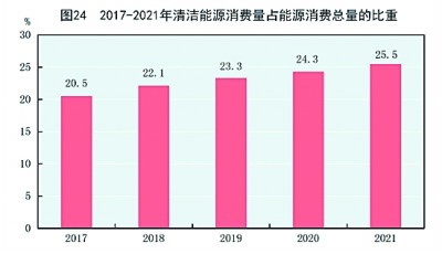 初步核算,全年能源消費(fèi)總量52.4億噸標(biāo)準(zhǔn)煤,比上年增長(zhǎng)5.2%。煤炭消費(fèi)量增長(zhǎng)4.6%,原油消費(fèi)量增長(zhǎng)4.1%,天然氣消費(fèi)量增長(zhǎng)12.5%,電力消費(fèi)量增長(zhǎng)10.3%。煤炭消費(fèi)量占能源消費(fèi)總量的56.0%,比上年下降0.9個(gè)百分點(diǎn);天然氣、水電、核電、風(fēng)電、太陽(yáng)能發(fā)電等清潔能源消費(fèi)量占能源消費(fèi)總量的25.5%,上升1.2個(gè)百分點(diǎn)。重點(diǎn)耗能工業(yè)企業(yè)單位電石綜合能耗下降5.3%,單位合成氨綜合能耗與上年持平,噸鋼綜合能耗下降0.4%,單位電解鋁綜合能耗下降2.1%,每千瓦時(shí)火力發(fā)電標(biāo)準(zhǔn)煤耗下降0.5%。全國(guó)萬元國(guó)內(nèi)生產(chǎn)總值二氧化碳排放[78]下降3.8%。(見圖24)