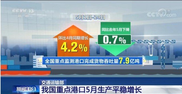 央視網(wǎng)消息:5月26日,交通運輸部發(fā)布數(shù)據(jù)顯示,5月以來,全國港口航道保持暢通,主要生產(chǎn)指標(biāo)穩(wěn)定向好。