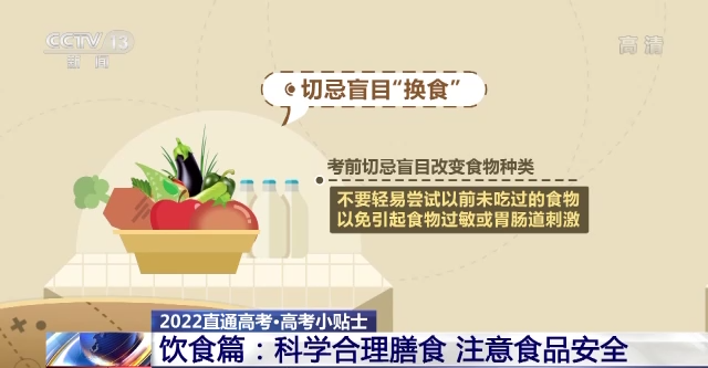 切忌盲目“換食”。考前切忌盲目改變食物種類,不要輕易嘗試以前未吃過的食物,以免引起食物過敏或胃腸道刺激。