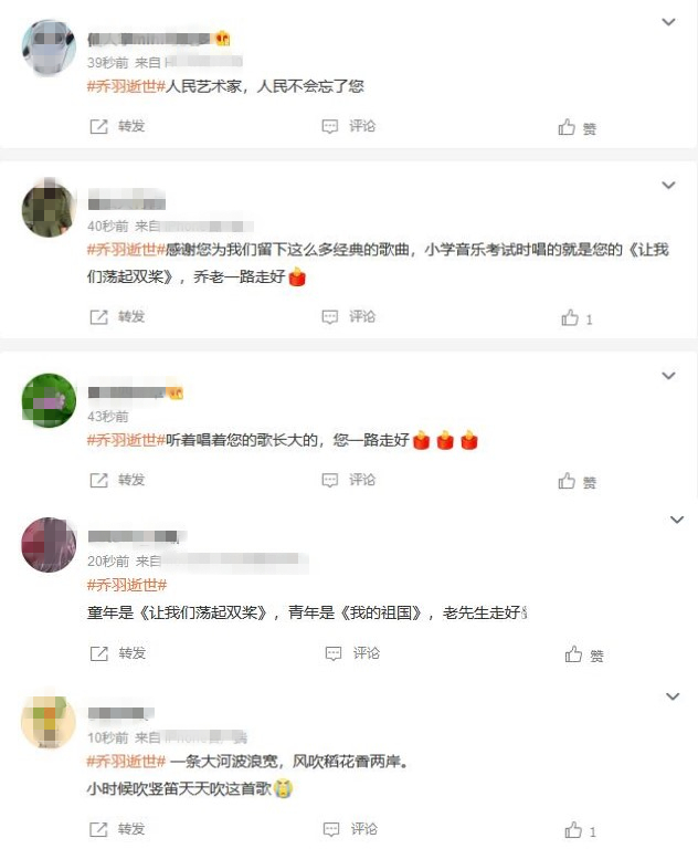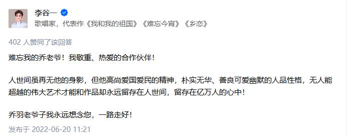 李谷一在聽(tīng)聞喬羽逝世的消息后,第一時(shí)間發(fā)文悼念:“難忘我的喬老爺!我敬重、熱愛(ài)的合作伙伴!人世間雖再無(wú)他的身影,但他高尚愛(ài)國(guó)愛(ài)民的精神,樸實(shí)無(wú)華、善良可愛(ài)幽默的人品性格,無(wú)人能超越的偉大藝術(shù)才能和作品卻永遠(yuǎn)留存在人世間,留存在億萬(wàn)人的心中!喬羽老爺子我永遠(yuǎn)想念您,一路走好!”