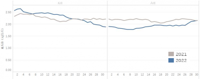 從價格走勢看(圖1),呈現(xiàn)三個特點:一是整體處于低價區(qū)間。6月是我國露地蔬菜生產(chǎn)旺季,全國平均氣溫、平均降水量較常年同期偏高,平均日照時數(shù)較2021年偏多,整體有利于蔬菜生產(chǎn),供應(yīng)較為充足,月均地頭價環(huán)比、同比均呈下降態(tài)勢。二是月內(nèi)上旬呈下降趨勢。6月9日蔬菜地頭價1.78元/公斤,較月初1.90元/公斤下降了6.3%,跌至2022年以來的最低點,比年內(nèi)最高價(4.21元/公斤)下降57.7%。三是中下旬價格止跌回升。經(jīng)歷6月10—16日和26—30日兩輪較大幅度上漲,月末價格達到2.16元/公斤,比6月9日價格上升了21.3%。上漲主要原因:一方面,黃淮海及環(huán)渤海等地區(qū)因持續(xù)高溫天氣,設(shè)施蔬菜提前拉秧,供應(yīng)量減少。另一方面,南方持續(xù)降雨影響蔬菜正常生長和采收,江西、湖南、廣西、福建等省部分地區(qū)發(fā)生不同程度洪澇災(zāi)害,100多萬畝蔬菜受災(zāi)。此外,受疫情影響的社會性消費開始復(fù)蘇,蔬菜需求量增加。