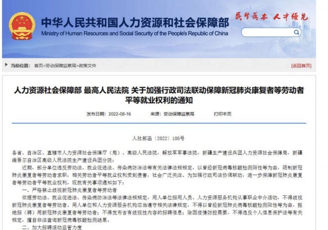 中國青年報客戶端北京8月16日電(中青報·中青網(wǎng)記者 李桂杰)人力資源和社會保障部、最高人民法院今天發(fā)布《關(guān)于加強行政司法聯(lián)動保障新冠肺炎康復(fù)者等勞動者平等就業(yè)權(quán)利的通知》(以下簡稱《通知》),再次重申嚴(yán)格禁止歧視新冠肺炎康復(fù)者等勞動者,并就加強就業(yè)歧視案件審理工作作出部署。