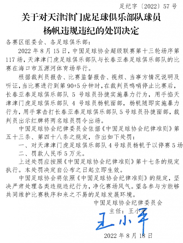18日晚,中國足協(xié)網(wǎng)站發(fā)布4則球員、俱樂部官員違規(guī)違紀(jì)的處罰決定,中超天津津門虎球員楊帆、中超長春亞泰球員孫捷及中乙青島紅獅球員王建文均停賽5場,中甲遼寧沈陽城市足球俱樂部官員林濤6場比賽禁止進(jìn)入體育場。處罰決定全文如下: