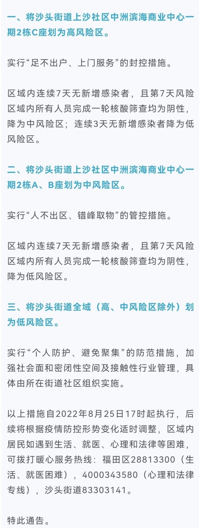 8月25日,廣東省深圳市福田區(qū)新型冠狀病毒肺炎疫情防控指揮部發(fā)布通告稱,根據(jù)當(dāng)前福田區(qū)疫情防控工作需要,按照國務(wù)院應(yīng)對新型冠狀病毒肺炎疫情聯(lián)防聯(lián)控機(jī)制綜合組《新型冠狀病毒肺炎疫情防控方案(第九版)》和《廣東省新冠肺炎本地疫情應(yīng)急處置方案(第五版)》相關(guān)規(guī)定,經(jīng)專家組研判,自2022年8月25日起,福田區(qū)在沙頭街道劃定高風(fēng)險區(qū)、中風(fēng)險區(qū)、低風(fēng)險區(qū)如下: