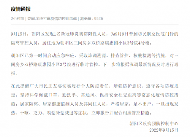 9月15日,北京朝陽(yáng)區(qū)發(fā)現(xiàn)1名新冠肺炎初篩陽(yáng)性人員,為9月9日曾到訪民航總醫(yī)院門(mén)診的隔離管控人員,居住地為朝陽(yáng)區(qū)三間房鄉(xiāng)雙橋路康惠園小區(qū)3號(hào)院4號(hào)樓。