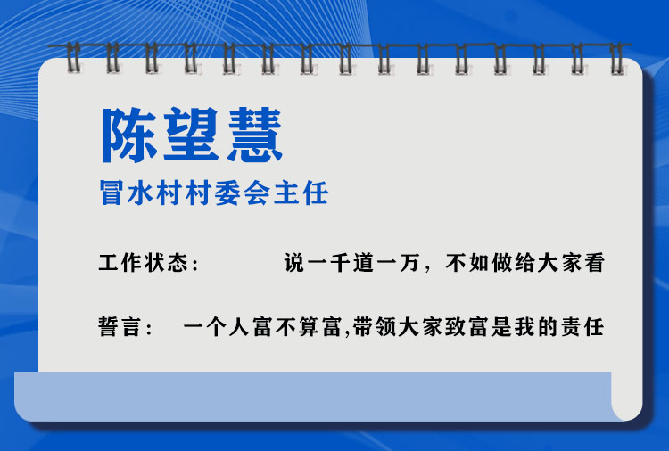2011年,陳望慧加入了中國(guó)共產(chǎn)黨。這一年,冒水村換屆選舉,陳望慧作為村上的致富能人,在村黨支部多次動(dòng)員和群眾的勸說下,放下經(jīng)營(yíng)多年、收入可觀的飯店回村,當(dāng)選為冒水村村委會(huì)主任。