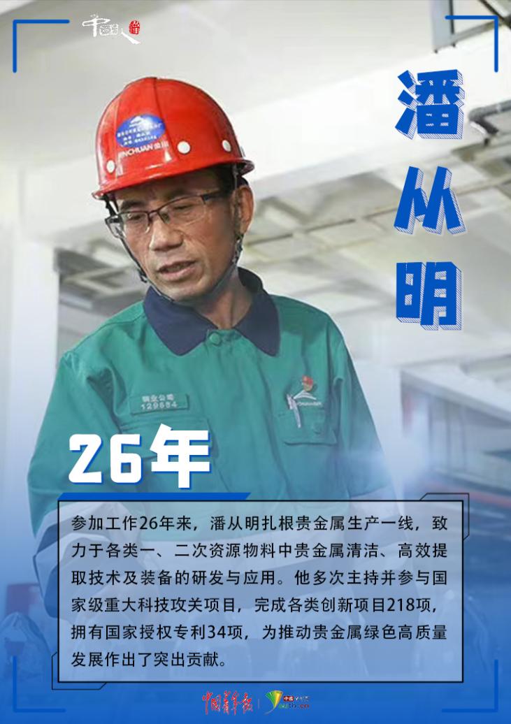 參加工作26年來,潘從明扎根貴金屬生產(chǎn)一線,致力于各類一、二次資源物料中貴金屬清潔、高效提取技術(shù)及裝備的研發(fā)與應(yīng)用。他多次主持并參與國家級重大科技攻關(guān)項目,完成各類創(chuàng)新項目218項,擁有國家授權(quán)專利34項,為推動貴金屬綠色高質(zhì)量發(fā)展作出了突出貢獻。