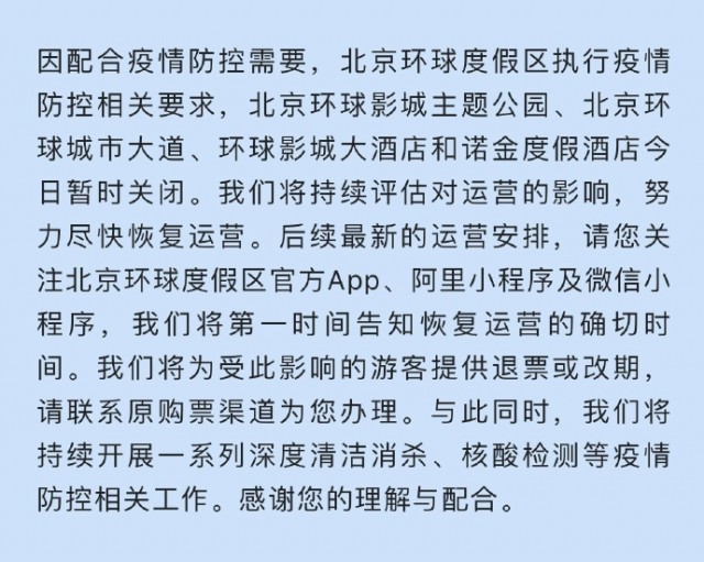據(jù)@北京環(huán)球度假區(qū) 微博消息,因配合疫情防控需要,北京環(huán)球度假區(qū)執(zhí)行疫情防控相關(guān)要求,北京環(huán)球影城主題公園、北京環(huán)球城市大道、環(huán)球影城大酒店和諾金度假酒店今日暫時(shí)關(guān)閉。我們將持續(xù)評(píng)估對運(yùn)營的影響,努力盡快恢復(fù)運(yùn)營。后續(xù)最新的運(yùn)營安排,請您關(guān)注北京環(huán)球度假區(qū)官方App、阿里小程序及微信小程序,我們將第一時(shí)間告知恢復(fù)運(yùn)營的確切時(shí)間。我們將為受此影響的游客提供退票或改期,請聯(lián)系原購票渠道為您辦理。與此同時(shí),我們將持續(xù)開展一系列深度清潔消殺、核酸檢測等疫情防控相關(guān)工作。感謝您的理解與配合。