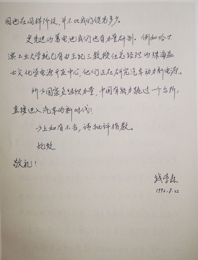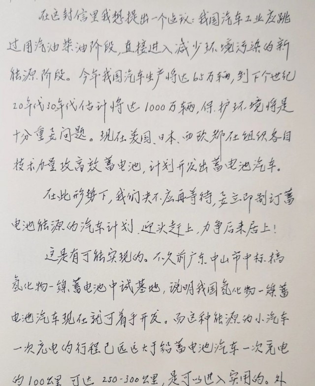 信中說(shuō),“在此形勢(shì)下,我們絕不應(yīng)再等待,要立即制訂蓄電池能源的汽車計(jì)劃,迎頭趕上,力爭(zhēng)后來(lái)居上?!?/p>