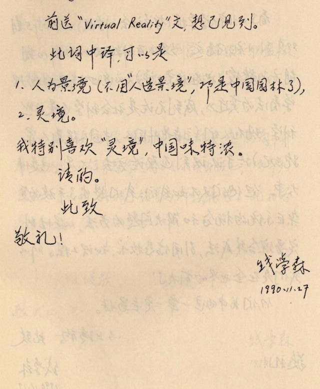 1990年11月27日,錢學(xué)森在信中將VR翻譯為“靈境”。錢學(xué)森圖書館供圖
