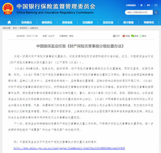 銀保監(jiān)會(huì)網(wǎng)站11月8日消息,為進(jìn)一步提升財(cái)產(chǎn)保險(xiǎn)災(zāi)害事故處置能力,切實(shí)發(fā)揮保險(xiǎn)防災(zāi)減損和經(jīng)濟(jì)補(bǔ)償功能。近日,中國(guó)銀保監(jiān)會(huì)印發(fā)《財(cái)產(chǎn)保險(xiǎn)災(zāi)害事故分級(jí)處置辦法》(以下簡(jiǎn)稱《辦法》)。