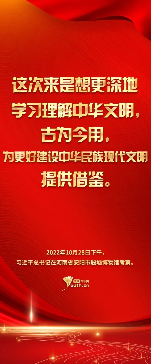 參天之木,必有其根;懷山之水,必有其源。習(xí)總書記的這次殷墟考察之行,讓我們將目光再次聚焦到中華民族的傳統(tǒng)文化之上。青山百代,仍蔭后人。正如習(xí)總書記指出的——中華優(yōu)秀傳統(tǒng)文化是我們黨創(chuàng)新理論的“根”,我們推進(jìn)馬克思主義中國(guó)化時(shí)代化的根本途徑是“兩個(gè)結(jié)合”——民族要獨(dú)立自強(qiáng),國(guó)家欲穩(wěn)步發(fā)展,文化是來自深處的支撐。作為當(dāng)代青年,我們理應(yīng)響應(yīng)時(shí)代號(hào)召,跟隨習(xí)近平總書記的腳步,去深入了解學(xué)習(xí)中華文明,兼顧歷史之沉淀與時(shí)代之新意,在向世界發(fā)揚(yáng)中華氣象的同時(shí),也邀得當(dāng)年之明月照徹今人。