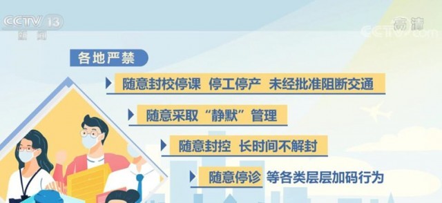 《通知》明確要求,各地嚴(yán)禁隨意封校停課、停工停產(chǎn)、未經(jīng)批準(zhǔn)阻斷交通,隨意采取“靜默”管理,隨意封控、長(zhǎng)時(shí)間不解封,隨意停診等各類層層加碼行為,加大通報(bào)、公開(kāi)曝光力度,對(duì)造成嚴(yán)重后果的依法依規(guī)嚴(yán)肅追責(zé)。對(duì)于沒(méi)有發(fā)生疫情的地區(qū),要嚴(yán)格按照第九版防控方案確定的范圍對(duì)風(fēng)險(xiǎn)崗位、重點(diǎn)人員開(kāi)展核酸檢測(cè),既不能隨意擴(kuò)大核酸檢測(cè)范圍,也不能隨意擴(kuò)大人員管控、社區(qū)封控、隔離轉(zhuǎn)運(yùn)范圍。糾正“一天兩檢”“一天三檢”等不科學(xué)做法。疫情發(fā)生地要分類有序做好外地滯留人員疏解,目的地不得拒絕接受滯留人員返回,既要避免疫情外溢,也不得加碼管控。