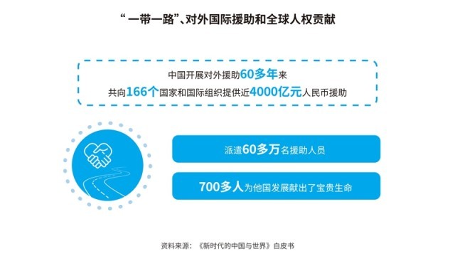 中國先后批準(zhǔn)或加入了30余項(xiàng)國際人權(quán)文書,其中包括6項(xiàng)聯(lián)合國核心人權(quán)條約;累計(jì)共向166個(gè)國家和國際組織提供了援助,派遣60多萬名援助人員;多次無條件免除重債窮國和最不發(fā)達(dá)國家對(duì)華到期政府無息貸款債務(wù)。在聯(lián)合國維和行動(dòng)中,中國是安理會(huì)常任理事國第一大出兵國,30多年來累計(jì)派出維和官兵5萬余人次。共建“一帶一路”已成為助力各國發(fā)展、深受世界歡迎的新興國際公共產(chǎn)品,據(jù)世界銀行研究報(bào)告,到2030年,將使相關(guān)國家760萬人擺脫極端貧困、3200萬人擺脫中度貧困。新冠肺炎疫情暴發(fā)以來,中國努力促進(jìn)新冠疫苗在全球范圍內(nèi)公平合理分配,成為全球?qū)ν馓峁┮呙鐢?shù)量最多的國家。
