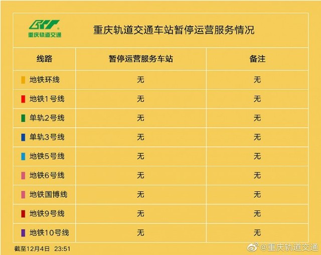 央視網消息:據@重慶軌道交通,12月5日06:30起,暫停運營服務的車站全部恢復運營服務。