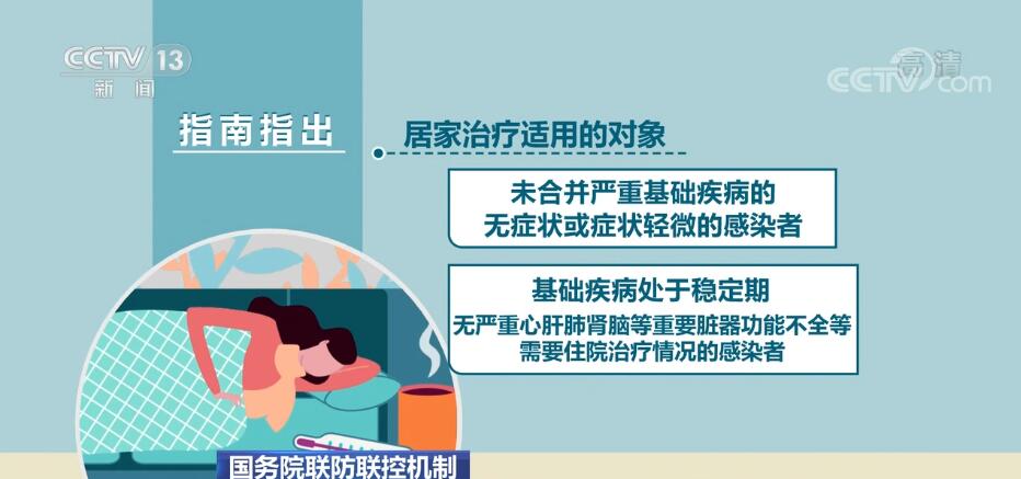 指南指出,居家治療適用的對(duì)象是:未合并嚴(yán)重基礎(chǔ)疾病的無癥狀或癥狀輕微的感染者;基礎(chǔ)疾病處于穩(wěn)定期,無嚴(yán)重心肝肺腎腦等重要臟器功能不全等需要住院治療情況的感染者。