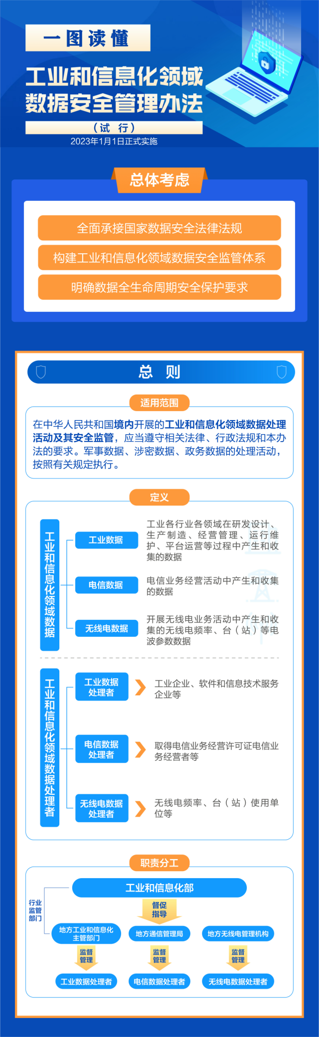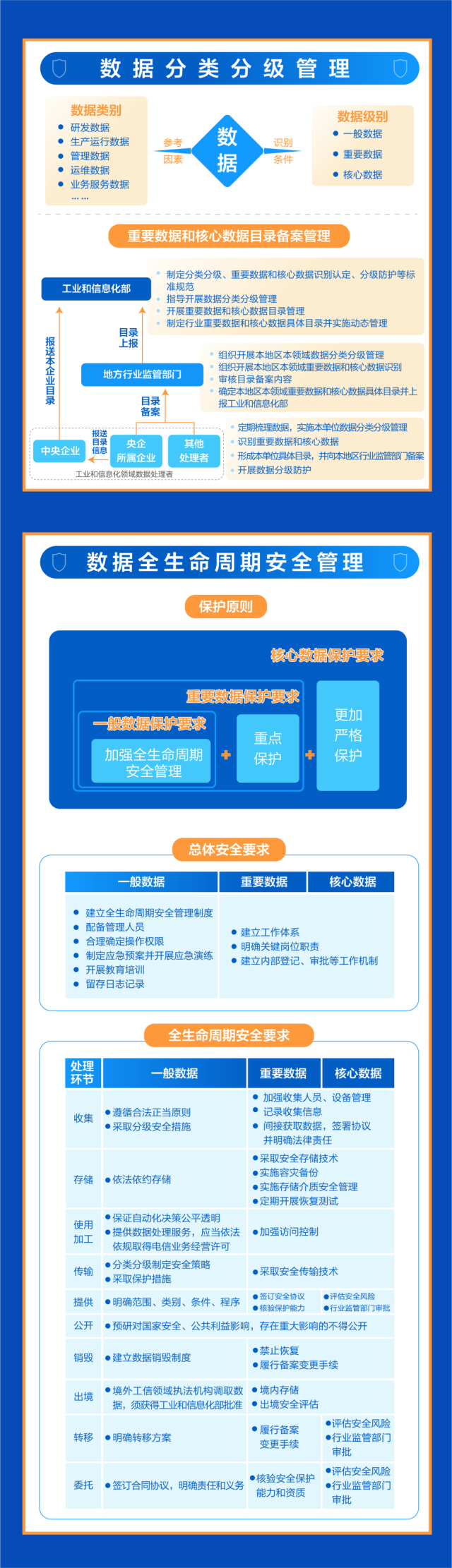 《管理辦法》以數(shù)據(jù)分級(jí)保護(hù)為總體原則,要求一般數(shù)據(jù)加強(qiáng)全生命周期安全管理,重要數(shù)據(jù)在一般數(shù)據(jù)保護(hù)的基礎(chǔ)上進(jìn)行重點(diǎn)保護(hù),核心數(shù)據(jù)在重要數(shù)據(jù)保護(hù)的基礎(chǔ)上實(shí)施更加嚴(yán)格保護(hù)。對(duì)于不同級(jí)別數(shù)據(jù)同時(shí)被處理且難以分別采取保護(hù)措施的,采取“就高”原則,按照其中級(jí)別最高的要求實(shí)施保護(hù)。