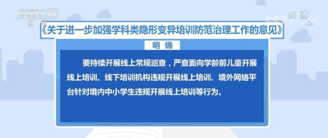 《意見》明確,要持續(xù)開展線上常規(guī)巡查,嚴查面向?qū)W齡前兒童開展線上培訓、線下培訓機構(gòu)違規(guī)開展線上培訓、境外網(wǎng)絡平臺針對境內(nèi)中小學生違規(guī)開展線上培訓等行為。