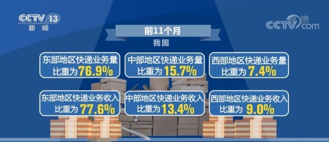 前11個(gè)月,我國東、中、西部地區(qū)快遞業(yè)務(wù)量比重分別為76.9%、15.7%和7.4%,業(yè)務(wù)收入比重分別為77.6%、13.4%和9.0%。與去年同期相比,東部地區(qū)快遞業(yè)務(wù)量比重下降1.3個(gè)百分點(diǎn),快遞業(yè)務(wù)收入比重下降0.6個(gè)百分點(diǎn)。中部地區(qū)快遞業(yè)務(wù)量比重上升1.2個(gè)百分點(diǎn),快遞業(yè)務(wù)收入比重上升0.5個(gè)百分點(diǎn)。西部地區(qū)快遞業(yè)務(wù)量比重上升0.1個(gè)百分點(diǎn),快遞業(yè)務(wù)收入比重上升0.1個(gè)百分點(diǎn)。