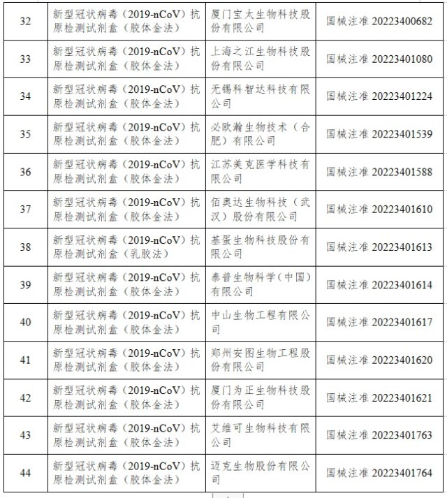 12月22日,經(jīng)國家藥監(jiān)局審查,批準(zhǔn)艾維可生物科技有限公司和邁克生物股份有限公司的2個新冠病毒抗原檢測試劑產(chǎn)品。截至目前,國家藥監(jiān)局已批準(zhǔn)44個新冠病毒抗原檢測試劑產(chǎn)品。