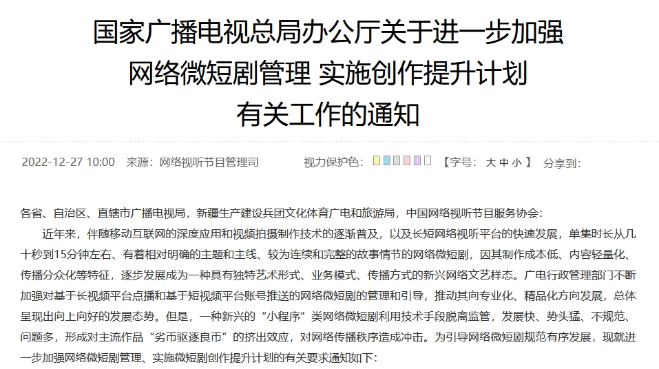 然而一種新興的“小程序”類網(wǎng)絡(luò)微短劇利用技術(shù)手段脫離監(jiān)管,發(fā)展快、勢頭猛、不規(guī)范、問題多,形成對主流作品“劣幣驅(qū)逐良幣”的擠出效應(yīng),對網(wǎng)絡(luò)傳播秩序造成沖擊。為引導(dǎo)網(wǎng)絡(luò)微短劇規(guī)范有序發(fā)展,廣電總局此次就進(jìn)一步加強(qiáng)網(wǎng)絡(luò)微短劇管理、實(shí)施微短劇創(chuàng)作提升計劃發(fā)布一系列具體措施。