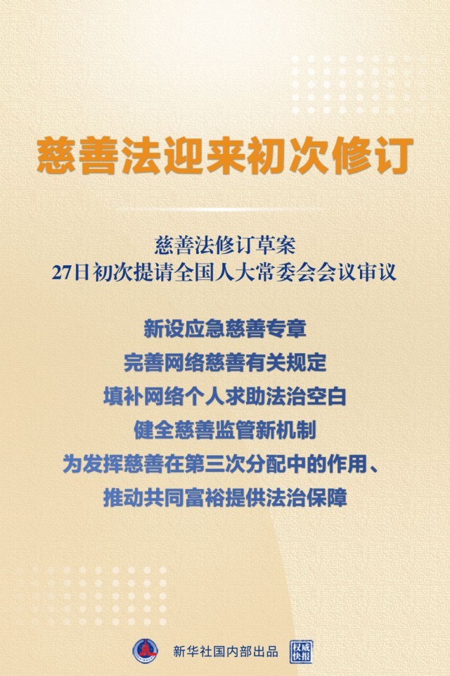 - 慈善法修訂草案提請(qǐng)審議:新設(shè)應(yīng)急慈善專章 完善網(wǎng)絡(luò)慈善規(guī)定 填補(bǔ)網(wǎng)絡(luò)個(gè)人求助法治空白