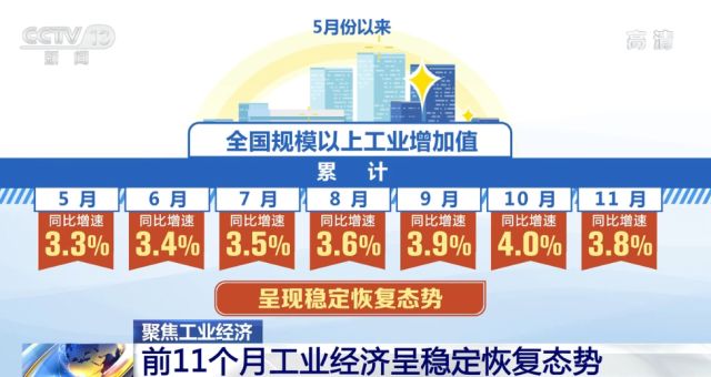 央視網(wǎng)消息:工業(yè)是經(jīng)濟增長的主體和引擎,振作工業(yè)經(jīng)濟是穩(wěn)住經(jīng)濟大盤的堅實支撐。最新數(shù)據(jù)顯示,今年前11個月,全國規(guī)模以上工業(yè)增加值同比增長3.8%。自5月份以來,同比增速持續(xù)提升,呈現(xiàn)穩(wěn)定恢復態(tài)勢,有力支撐了國民經(jīng)濟平穩(wěn)運行。