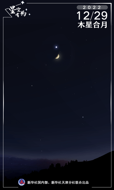 新華社天津12月27日電(記者周潤?。┨煳目破諏<医榻B,12月29日晚天宇將上演木星合月,這是2022年最后一場行星合月。屆時只要天氣晴好,我國公眾可在南方天空欣賞到明亮木星與一輪上弦月近距離競輝的唯美畫面。