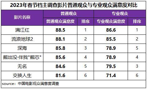 2023年春節(jié)檔不同類型影片各展所長,普通觀眾和專業(yè)觀眾對影片整體評價趨同,但在細(xì)分維度評價上各有所愛,對《深?!泛汀稛o名》兩部影片的滿意度評價排序上也出現(xiàn)倒置。