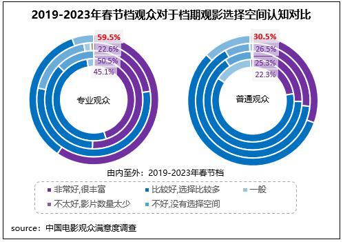 在調(diào)查中,針對“您認(rèn)為檔期觀影選擇空間如何”這一問題,普通觀眾和專業(yè)觀眾認(rèn)為檔期觀影選擇“非常好,很豐富”的占比均為2019年來的最高值。