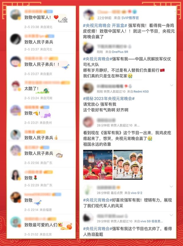 “請黨放心,強(qiáng)軍有我”“清澈的愛,獻(xiàn)給我的祖國”……聲聲誓言、字字鏗鏘。首次參加總臺元宵晚會的中國人民解放軍儀仗司禮大隊奏唱的歌曲《強(qiáng)軍有我》,不僅唱出中國軍人的拳拳赤子心,更唱出了“最可愛的人”那豪邁激情和磅礴氣勢。整齊劃一的動作、堅定有力的眼神讓無數(shù)網(wǎng)友直呼:“震撼!這就是中國排面”“為人民子弟兵熱淚盈眶”“致敬中國軍人!感謝你們?yōu)榇蠹邑?fù)重前行”。而網(wǎng)友們也用整齊一致的留言共同致敬“最可愛的人”。