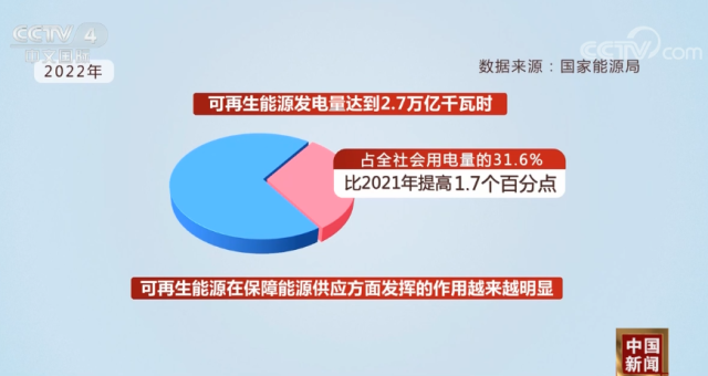 2022年,中國可再生能源呈現(xiàn)發(fā)展速度快、運行質量好、利用水平高、產業(yè)競爭力強的良好態(tài)勢,取得了諸多里程碑式的新成績。2022年,中國風電、光伏發(fā)電量達到1.19萬億千瓦時,比2021年增加2073億千瓦時,同比增長21%,接近全國城鄉(xiāng)居民生活用電量。2022年,可再生能源發(fā)電量達到2.7萬億千瓦時,占全社會用電量的31.6%,比2021年提高1.7個百分點,可再生能源在保障能源供應方面發(fā)揮的作用越來越明顯,可再生能源新增裝機已成為中國電力新增裝機的主體。