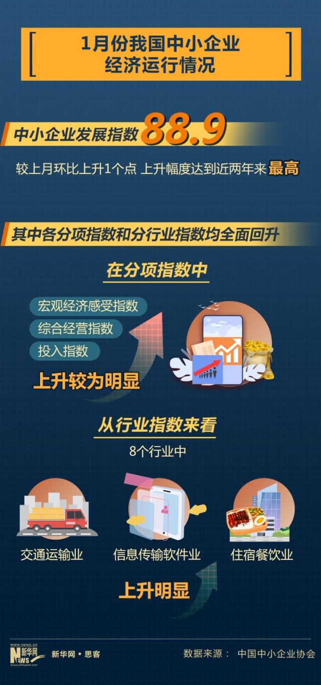 近日中國中小企業(yè)協(xié)會公布我國中小企業(yè)經(jīng)濟(jì)運行情況。2023年1月份,中國中小企業(yè)發(fā)展指數(shù)為88.9,比去年12月回升1個點,上升幅度達(dá)到近兩年來最高。其中,企業(yè)發(fā)展信心回升,反映企業(yè)信心狀況的宏觀經(jīng)濟(jì)感受指數(shù)為98.7,比上月上升2.1點。市場預(yù)期有所提振,市場指數(shù)為80.7,環(huán)比上升0.9點。