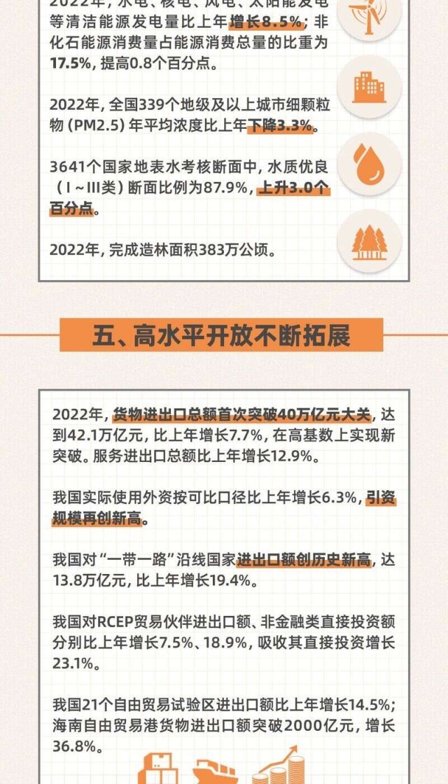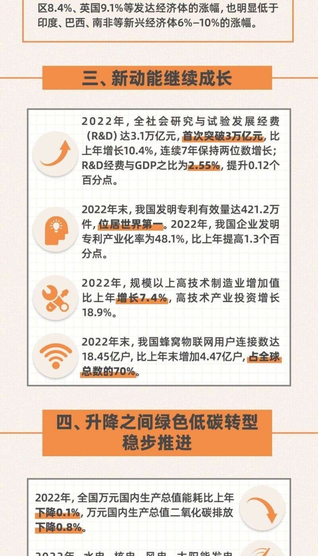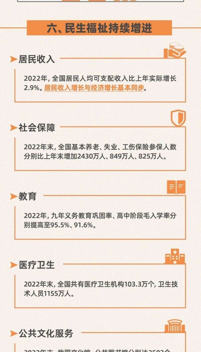 今日,國家統(tǒng)計局發(fā)布2022年國民經濟和社會發(fā)展統(tǒng)計公報。初步核算,經濟總量突破120萬億元,再上新臺階;全年糧食產量連續(xù)8年穩(wěn)定在1.3萬億斤以上;全部工業(yè)增加值首次超過40萬億元;全國城鎮(zhèn)新增就業(yè)1206萬人,超額完成年度目標任務;CPI月度漲幅始終低于3%;貨物進出口總額首次突破40萬億元大關;引資規(guī)模再創(chuàng)新高;全國居民人均可支配收入實際增長2.9%......轉存圖解,看看這些數(shù)字背后2022年的中國。