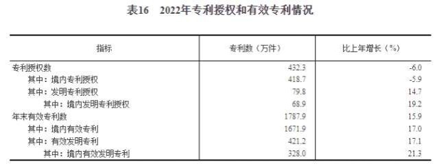 全年授予專利權(quán)432.3萬件,比上年下降6.0%;PCT專利申請受理量7.4萬件。截至年末,有效專利1787.9萬件,其中境內(nèi)有效發(fā)明專利328.0萬件。每萬人口高價(jià)值發(fā)明專利擁有量9.4件。全年商標(biāo)注冊617.7萬件,比上年下降20.2%。全年共簽訂技術(shù)合同77萬項(xiàng),技術(shù)合同成交金額47791億元,比上年增長28.2%。我國公民具備科學(xué)素質(zhì)的比例達(dá)到12.93%。