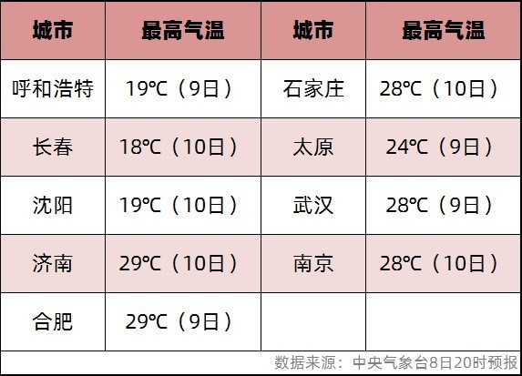多地最高氣溫還將繼續(xù)突破紀(jì)錄。大城市中,呼和浩特、長(zhǎng)春、沈陽(yáng)、濟(jì)南、合肥氣溫都可能刷新當(dāng)?shù)?月上旬最高紀(jì)錄,石家莊、太原、武漢、南京等地也會(huì)經(jīng)歷同期少見(jiàn)的暖。