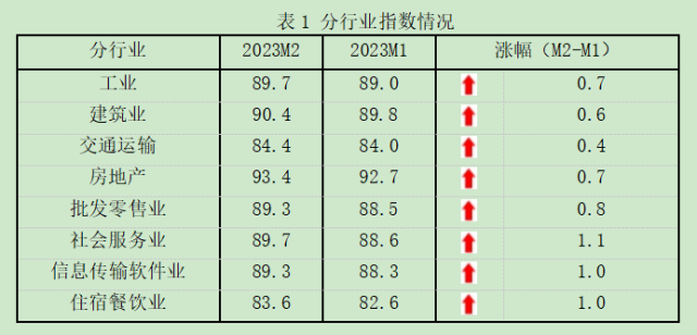 2月份,隨著經(jīng)濟(jì)逐步恢復(fù),8個(gè)行業(yè)指數(shù)均連續(xù)兩個(gè)月上升。服務(wù)業(yè)指數(shù)恢復(fù)速度領(lǐng)先,其中,社會(huì)服務(wù)業(yè)、信息傳輸計(jì)算機(jī)服務(wù)軟件業(yè)、住宿餐飲業(yè)和批發(fā)零售業(yè)指數(shù)分別上升1.1、1.0、1.0和0.8點(diǎn)。