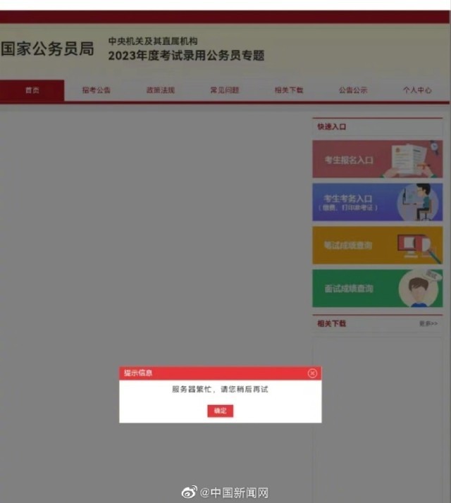 另?yè)?jù)中新網(wǎng)報(bào)道,14日晚間,不少考生在網(wǎng)站曬出剛剛查到的2023國(guó)考筆試成績(jī)。一些網(wǎng)友反映2023國(guó)考專題網(wǎng)頁(yè)上分?jǐn)?shù)查詢通道擁擠,網(wǎng)頁(yè)顯示“服務(wù)器繁忙”。