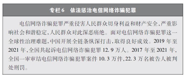 加大網(wǎng)絡(luò)犯罪懲治力度。隨著互聯(lián)網(wǎng)技術(shù)的快速發(fā)展,傳統(tǒng)犯罪加速向以互聯(lián)網(wǎng)為媒介的非接觸式犯罪轉(zhuǎn)變,電信網(wǎng)絡(luò)詐騙、網(wǎng)絡(luò)賭博、網(wǎng)絡(luò)淫穢色情等涉網(wǎng)違法犯罪多發(fā)。中國依法辦理新型網(wǎng)絡(luò)犯罪案件。連續(xù)多年開展“凈網(wǎng)行動”,嚴(yán)厲打擊群眾反映強(qiáng)烈的黑客攻擊破壞、侵犯公民個人信息等違法犯罪活動。持續(xù)推進(jìn)“云劍”“斷卡”“斷流”“拔釘”等專項行動,打擊套路貸、校園貸、“以房養(yǎng)老”、“投資養(yǎng)老”等電信網(wǎng)絡(luò)詐騙犯罪,依法懲處為電信網(wǎng)絡(luò)詐騙犯罪團(tuán)伙提供互聯(lián)網(wǎng)接入、域名注冊、服務(wù)器托管、移動互聯(lián)網(wǎng)應(yīng)用程序制作開發(fā)、網(wǎng)絡(luò)支付、引流推廣等服務(wù)支撐的黑灰產(chǎn)業(yè)。完善國家反詐大數(shù)據(jù)平臺和反詐移動互聯(lián)網(wǎng)應(yīng)用程序,建設(shè)國家涉詐黑樣本庫,完善快速止付凍結(jié)機(jī)制、涉詐資金返還機(jī)制。堅決打擊網(wǎng)絡(luò)賭博犯罪行為,從嚴(yán)治理網(wǎng)絡(luò)淫穢色情。網(wǎng)絡(luò)犯罪治理工作取得明顯成效,人民群眾安全感有效提升,社會更加和諧穩(wěn)定。