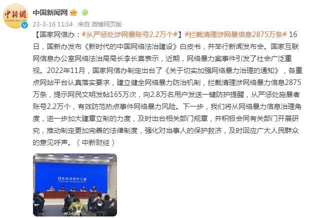 國家網(wǎng)信辦:攔截清理涉網(wǎng)絡(luò)暴力信息2875萬條,從嚴(yán)懲處涉網(wǎng)暴賬號2.2萬個(gè)