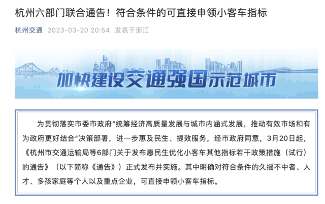 20日晚,杭州市交通運輸局等6部門發(fā)布通告明確,即日起,符合條件的“久搖不中”者、多孩家庭等個人以及重點企業(yè),可直接申領(lǐng)小客車指標。
