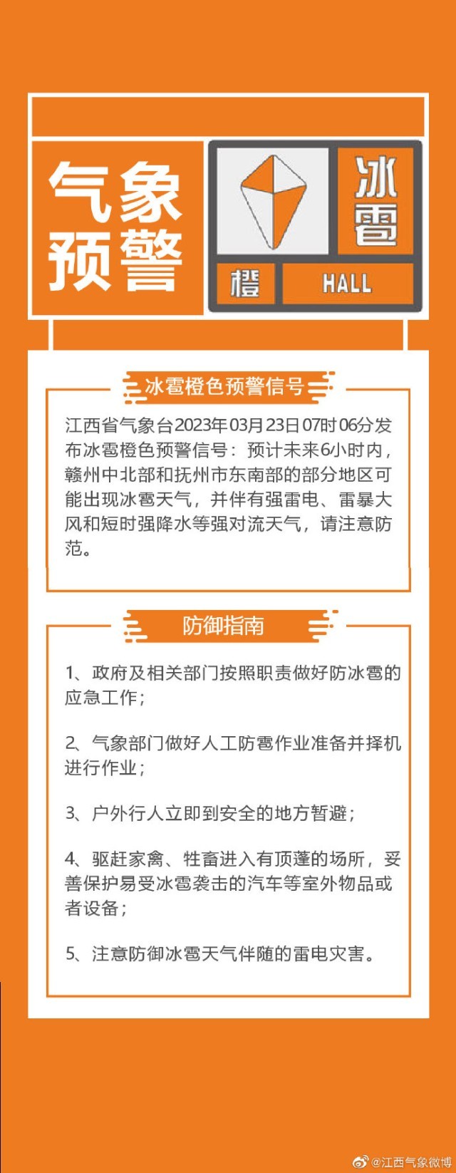 江西省氣象臺2023年03月23日07時06分發(fā)布冰雹橙色預警信號:預計未來6小時內,贛州中北部和撫州市東南部的部分地區(qū)可能出現冰雹天氣,并伴有強雷電、雷暴大風和短時強降水等強對流天氣,請注意防范。