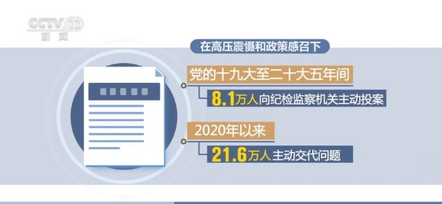 在高壓震懾和政策感召下,黨的十九大至二十大五年間,8.1萬人向紀(jì)檢監(jiān)察機關(guān)主動投案,2020年以來,21.6萬人主動交代問題。