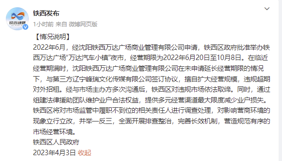 央視網(wǎng)消息:據(jù)@鐵西發(fā)布 微博4月3日消息,鐵西區(qū)人民政府發(fā)布情況說(shuō)明。2022年6月,經(jīng)沈陽(yáng)鐵西萬(wàn)達(dá)廣場(chǎng)商業(yè)管理有限公司申請(qǐng),鐵西區(qū)政府批準(zhǔn)舉辦鐵西萬(wàn)達(dá)廣場(chǎng)“萬(wàn)達(dá)汽車小鎮(zhèn)”夜市,經(jīng)營(yíng)期限為2022年6月20日至10月8日。在臨近經(jīng)營(yíng)期滿時(shí),沈陽(yáng)鐵西萬(wàn)達(dá)廣場(chǎng)商業(yè)管理有限公司在未申請(qǐng)延長(zhǎng)經(jīng)營(yíng)期限的情況下,與第三方遼寧峰瑞文化傳媒有限公司簽訂協(xié)議,擅自擴(kuò)大經(jīng)營(yíng)規(guī)模,違規(guī)超期對(duì)外招租。經(jīng)與市場(chǎng)主辦方多次溝通后,鐵西區(qū)對(duì)違規(guī)市場(chǎng)依法取締。同時(shí),通過(guò)組建法律援助團(tuán)隊(duì)維護(hù)業(yè)戶合法權(quán)益,提供多元經(jīng)營(yíng)渠道最大限度減少業(yè)戶損失。