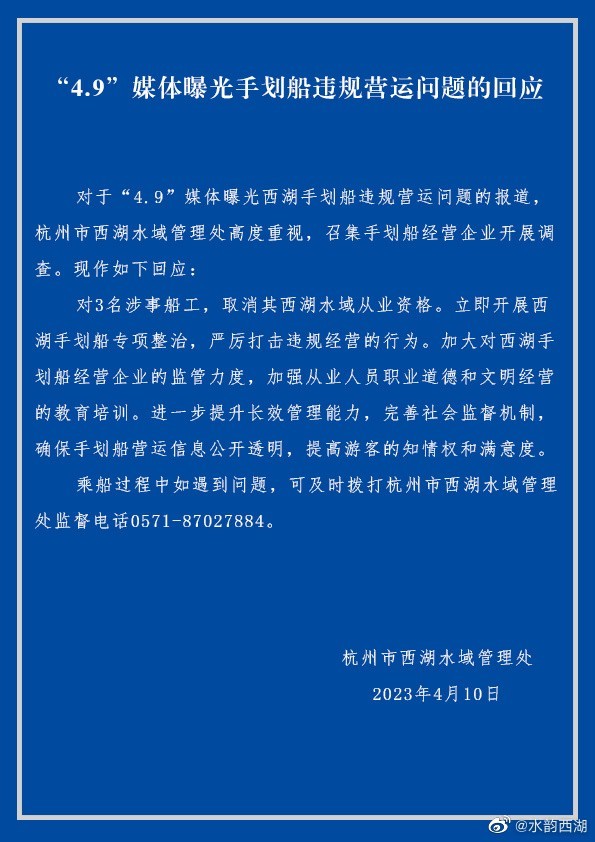 對涉事3名船工,取消其西湖水域從業(yè)資格。立即開展西湖手劃船專項整治,嚴(yán)厲打擊違規(guī)經(jīng)營的行為。加大對西湖手劃船經(jīng)營企業(yè)的監(jiān)管力度,加強(qiáng)從業(yè)人員職業(yè)道德和文明經(jīng)營的教育培訓(xùn)。進(jìn)一步提升長效管理能力,完善社會監(jiān)督機(jī)制,確保手劃船營運信息公開透明,提高游客的知情權(quán)和滿意度。