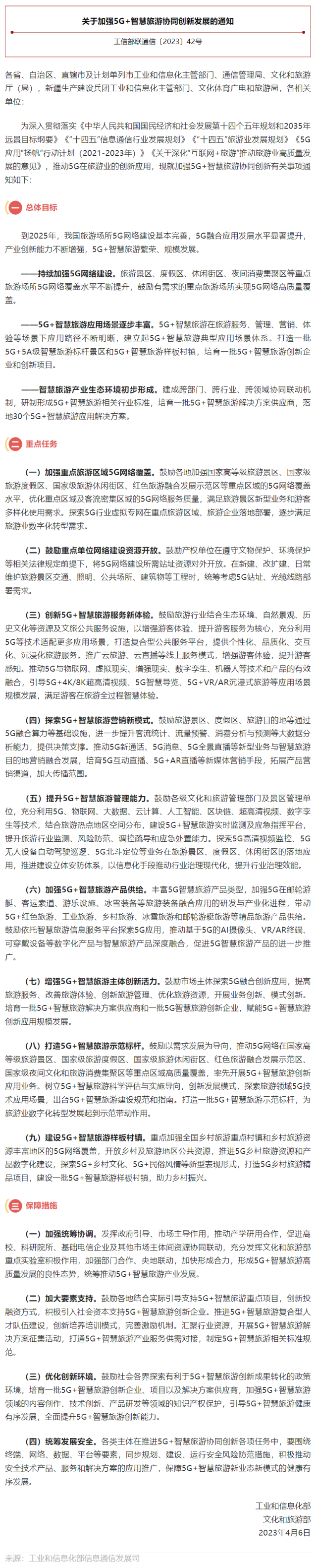 據(jù)“工信微報(bào)”公眾號(hào)消息,為深入推進(jìn)5G在旅游業(yè)的創(chuàng)新應(yīng)用,賦能旅游業(yè)數(shù)字化、網(wǎng)絡(luò)化、智能化轉(zhuǎn)型升級(jí),培育發(fā)展智慧旅游新業(yè)態(tài)、新模式,推動(dòng)5G智慧旅游協(xié)同創(chuàng)新發(fā)展,工業(yè)和信息化部聯(lián)合文化和旅游部印發(fā)《關(guān)于加強(qiáng)5G+智慧旅游協(xié)同創(chuàng)新發(fā)展的通知》。