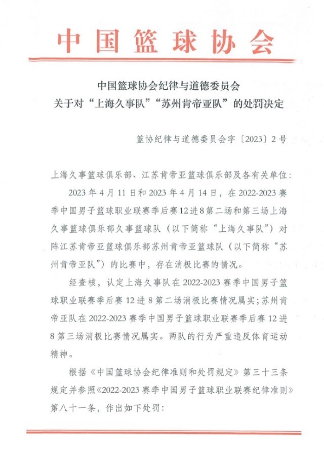 央視網(wǎng)消息:據(jù)@中國(guó)籃球協(xié)會(huì) 微博消息,4月17日,中國(guó)籃球協(xié)會(huì)紀(jì)律與道德委員會(huì)公布關(guān)于對(duì)“上海久事隊(duì)”“蘇州肯帝亞隊(duì)”的處罰決定。