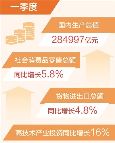國內需求逐步擴大。一季度,社會消費品零售總額同比增長5.8%,服務零售額保持兩位數(shù)增長。一季度,固定資產投資同比增長5.1%,與上年全年持平。