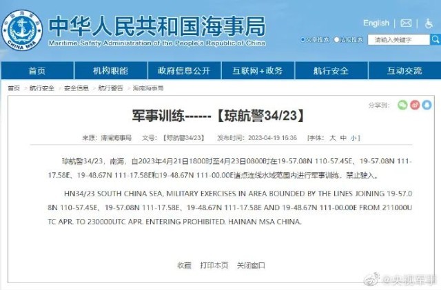 據(jù)中國海事局網(wǎng)站消息,清瀾海事局發(fā)布航行警告,自4月21日18時至4月23日8時,南海部分海域進行軍事訓(xùn)練,禁止駛?cè)搿?/p>